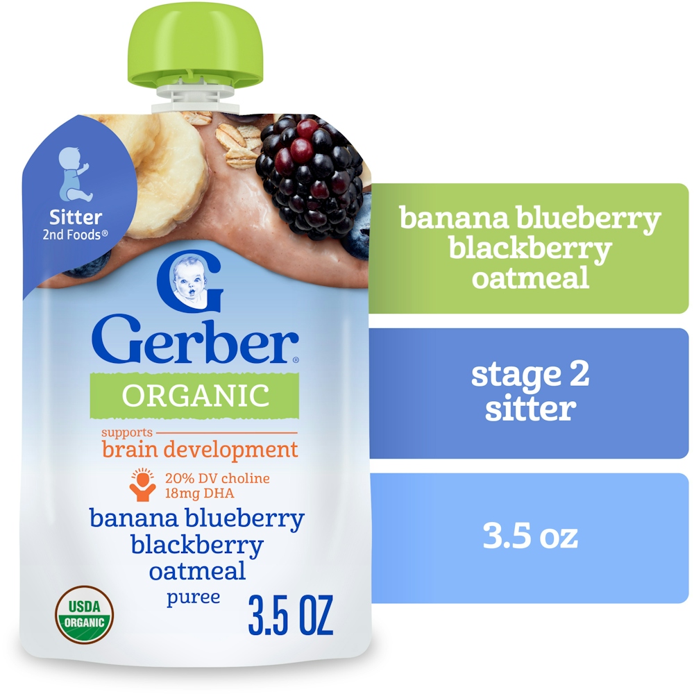 Gerber Organic Banana Blueberry Blackberry Oatmeal Baby Pouches are designed for busy parents seeking a nutritious and convenient solution. Gerber Pouches are crafted with wholesome ingredients, and strict quality standards, making them a premium choice for your little one. These baby food pouches are made for stage 2 sitters and have Choline & DHA. Gerber understands the importance of providing wholesome ingredients and purposeful nutrition as your baby grows and develops, that’s why our baby pouches are an ideal choice for parents who seek quality in their baby's diet. Our baby pouches are a trusted choice for countless families.