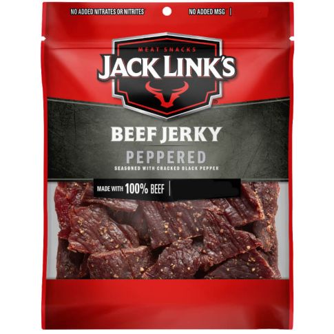 Jack Links Peppered Beef Jerky has 6g of protein and only 60 calories which will curb your hunger until dinnertime. Jack Links Peppered Beef Jerky is conveniently packed for snacking on the go, making it a great choice for camping trips, sporting events, hiking, and other activities.