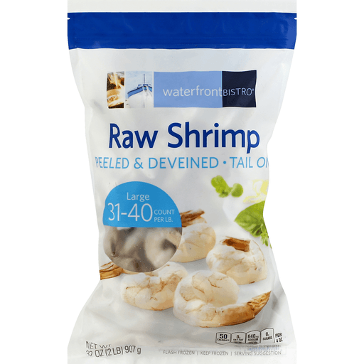 Waterfront Bistro, Large Raw Shrimp, Peeled & Deveined, Tail On is manufactured by Safeway, Inc. with a suggested serving size of 4 Onz (113 G) and has 120 calories per serving.