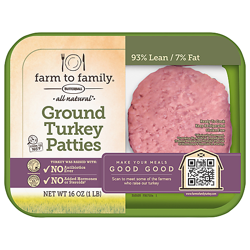 Farm to Family by Butterball ground turkey burger patties shine bright as a convenient, low-fat and gluten-free weeknight dinner. Farm to Family by Butterball believes everyone deserves the right to delicious turkey raised responsibly with no antibiotics ever. Plus, they're given room to grow on family farms that have been handed down from generation to generation. This Butterball turkey meat is minimally processed with zero artificial ingredients, hormones or steroids.* Skip the prep work and take these fresh turkey burgers straight to the grill, so you can get dinner on the table faster. Take your next family meal or backyard barbecue to the next level with turkey recipes at FarmToFamilyTurkey.com. *Federal regulations do not permit the use of hormones and steroids in poultry.
