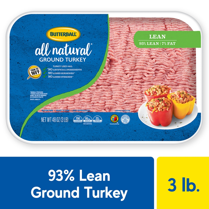 Make Butterball 93% lean ground turkey meat the star of your favorite recipe for a low-fat, gluten-free meal. Always tender and juicy, All Natural* Butterball turkey is minimally processed with no artificial ingredients and no hormones or steroids,** so you can feel good about the food you put on the table. With 19 grams of protein per serving, Butterball ground turkey provides an easy way to add lean protein to your weeknight meals. Enjoy this family-sized package of Butterball's fresh turkey meat all year long for family dinners, party appetizers or grilled lunches. Explore all the possibilities -- from turkey tacos to turkey chili -- with recipes on Butterball.com. *All Natural means minimally processed; no artificial ingredients. **Federal regulations prohibit the use of hormones and steroids in poultry.