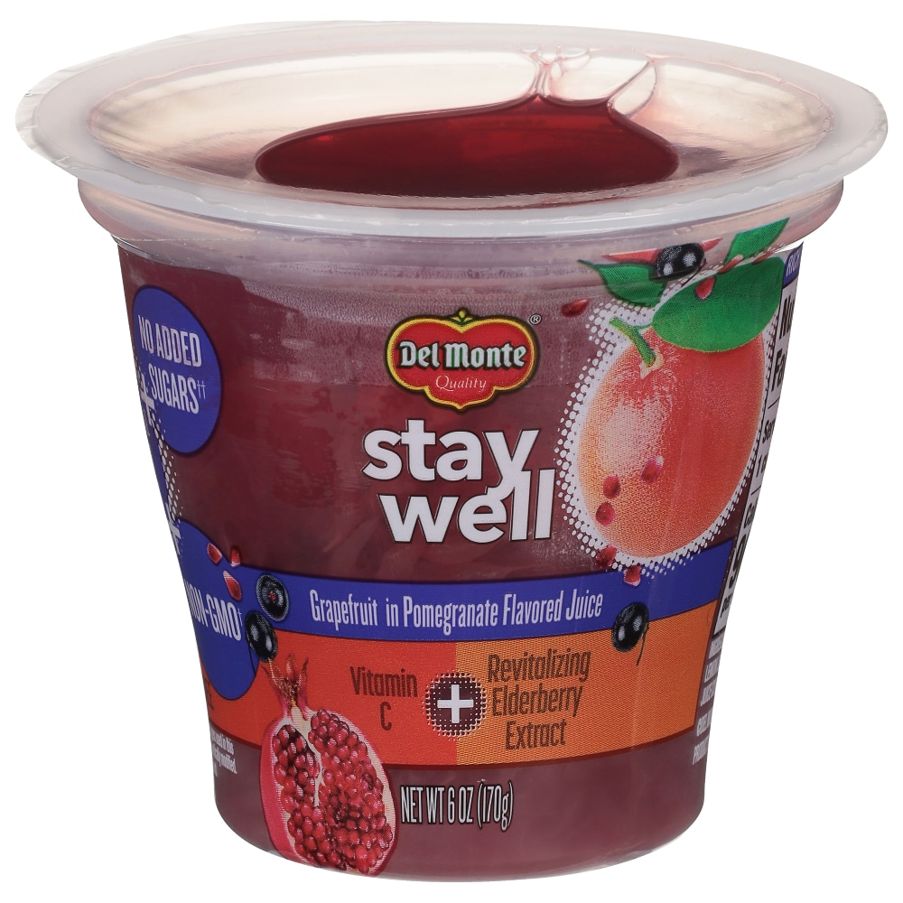 Del Monte® Stay Well contains delicious Grapefruit Chunks in Pomegranate Flavored Juice, infused with antioxidants and natural ingredients including Elderberry Extract and Vitamin C, which are especially beneficial to a healthy lifestyle. With a full serving of fruit and no added sugar, these delicious fruit cups make smart snacking easy! Enjoy on the go, before a workout or for a quick and refreshing snack at home. Available in the refrigerated fruit section.
