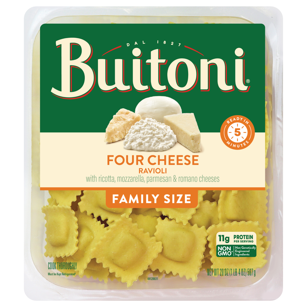 Serve up delicious pasta meals in minutes with Buitoni Four Cheese Ravioli. This convenient refrigerated package contains enough cheese ravioli pasta to feed the whole family and is ready in just five minutes. Buitoni Four Cheese Ravioli is filled with creamy ricotta, mozzarella, Parmesan and Romano cheeses and made with simple, high-quality, non-GMO ingredients. Ravioli is an Italian stuffed pasta that pairs well with an array of sauces and contains 11 grams of protein per serving. Top cheese ravioli with Buitoni Marinara Sauce, mozzarella cheese and baby spinach for an easy Italian dinner, or toss them with tomatoes, mozzarella cubes and Buitoni Pesto with Basil for a chilled pasta salad. With this 20 oz family-size package of Buitoni Four Cheese Ravioli, you can create crave-worthy, quick meals the whole family will enjoy. Buitoni provides convenient and delicious Italian-inspired meal solutions that give busy parents a fresh way to think about family dinner.