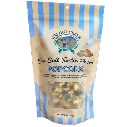 - The manufacturer of Sea Salt Turtle Pecan Popcorn is Walnut Creek.