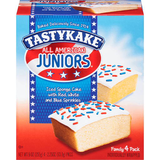- The manufacturer of Iced Sponge Cake with Red, White and Blue Sprinkles is Tasty Baking Company.