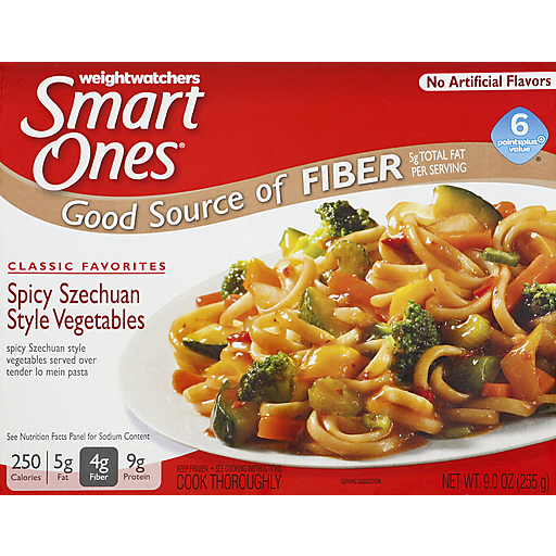 Smart Ones Spicy Szechuan Style Vegetables delivers delicious Asian inspired flavors to satisfy your cravings in an easy to make microwave meal thats ready in minutes. This frozen dinner features spicy Szechuan style vegetable blend served over lo mein noodles. As an added bonus, this tasty and easy Asian style food has 8 grams of protein per serving. Pull back film over noodle bowl to vent, microwave on high for 3 minutes and 15 seconds, stir and microwave for an additional 1 minute and 30 seconds. Each Smart Ones Spicy Szechuan Style Vegetables frozen entree comes packaged in a 9 ounce microwaveable tray for easy meal preparation.