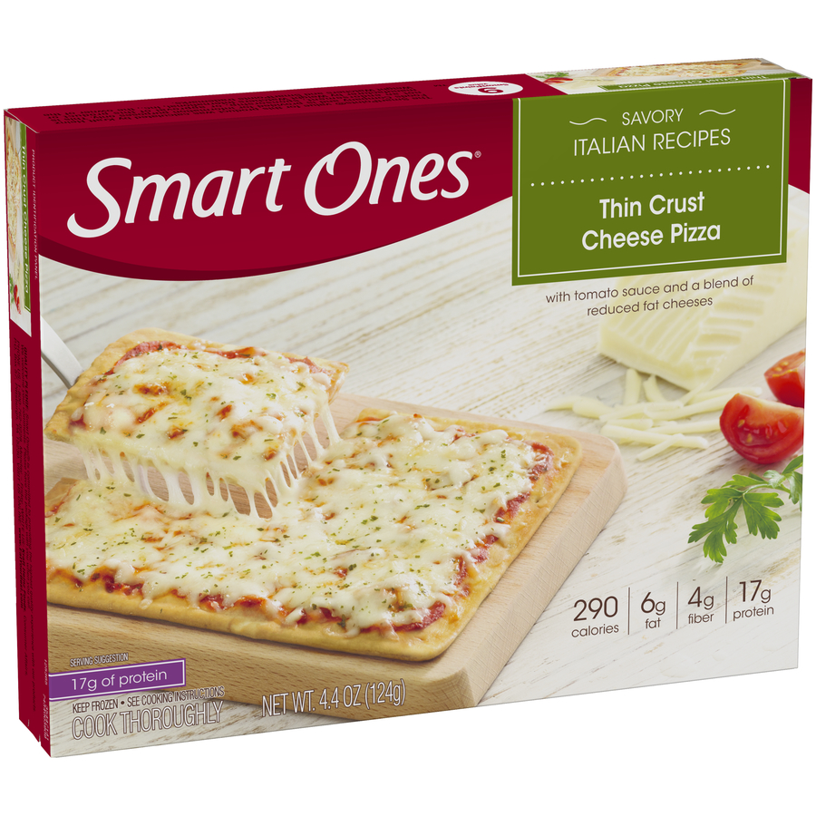 Smart Ones Thin Crust Cheese Pizza delivers delicious Italian inspired flavors to satisfy your cravings in an easy to make microwave meal that's ready in minutes. This frozen thin crust pizza features tomato sauce and a reduced fat cheese blend. As an added bonus, this tasty and easy personal pizza has 15 grams of protein per serving. Remove pizza from carton and plastic wrap, place individual pizza on cooking platform and silver card, and microwave on high for 2 minutes and 10 seconds. Each Smart Ones Thin Crust Cheese Pizza 4.4 ounce frozen entree comes packaged with a microwaveable platform for easy meal preparation.