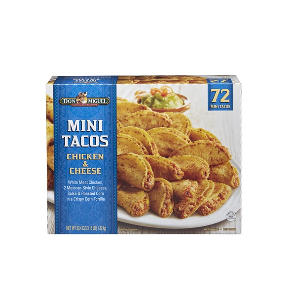 Los mini tacos vienen en crujientes tortillas de maíz empaquetadas con tres tipos de queso rallado, salsa y deliciosa pechuga de pollo marinada. Cada taco lleno de ingredientes recién preparados y de alta calidad.