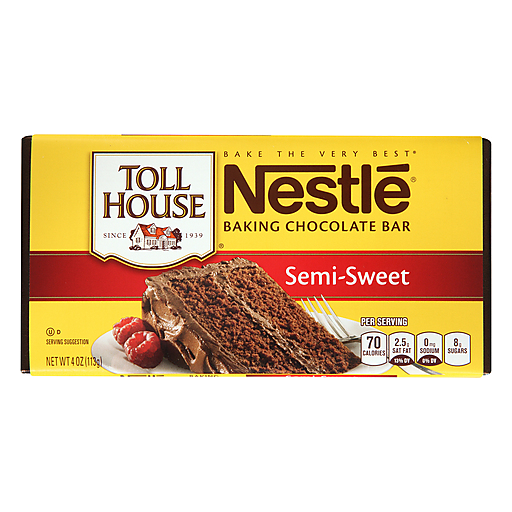 Nestle Toll House Baking Bar, Semi-sweet ChocolateSEMI-SWEET CHOCOLATE (SUGAR, CHOCOLATE, COCOA BUTTER, MILKFAT, SOY LECITHIN, NATURAL FLAVOR) .