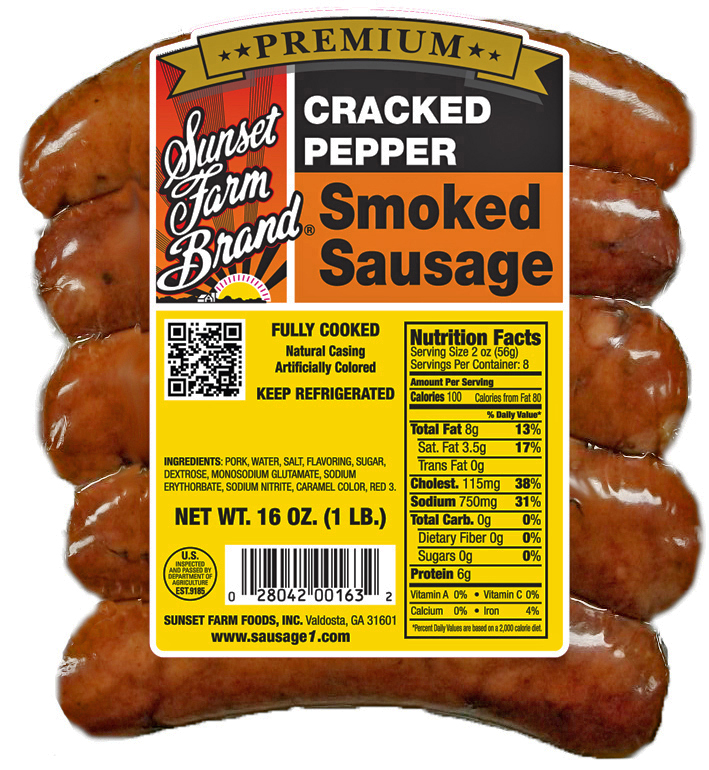 - The manufacturer of Crack Pepper Smoked Sausage is Sunset Farm Brand.