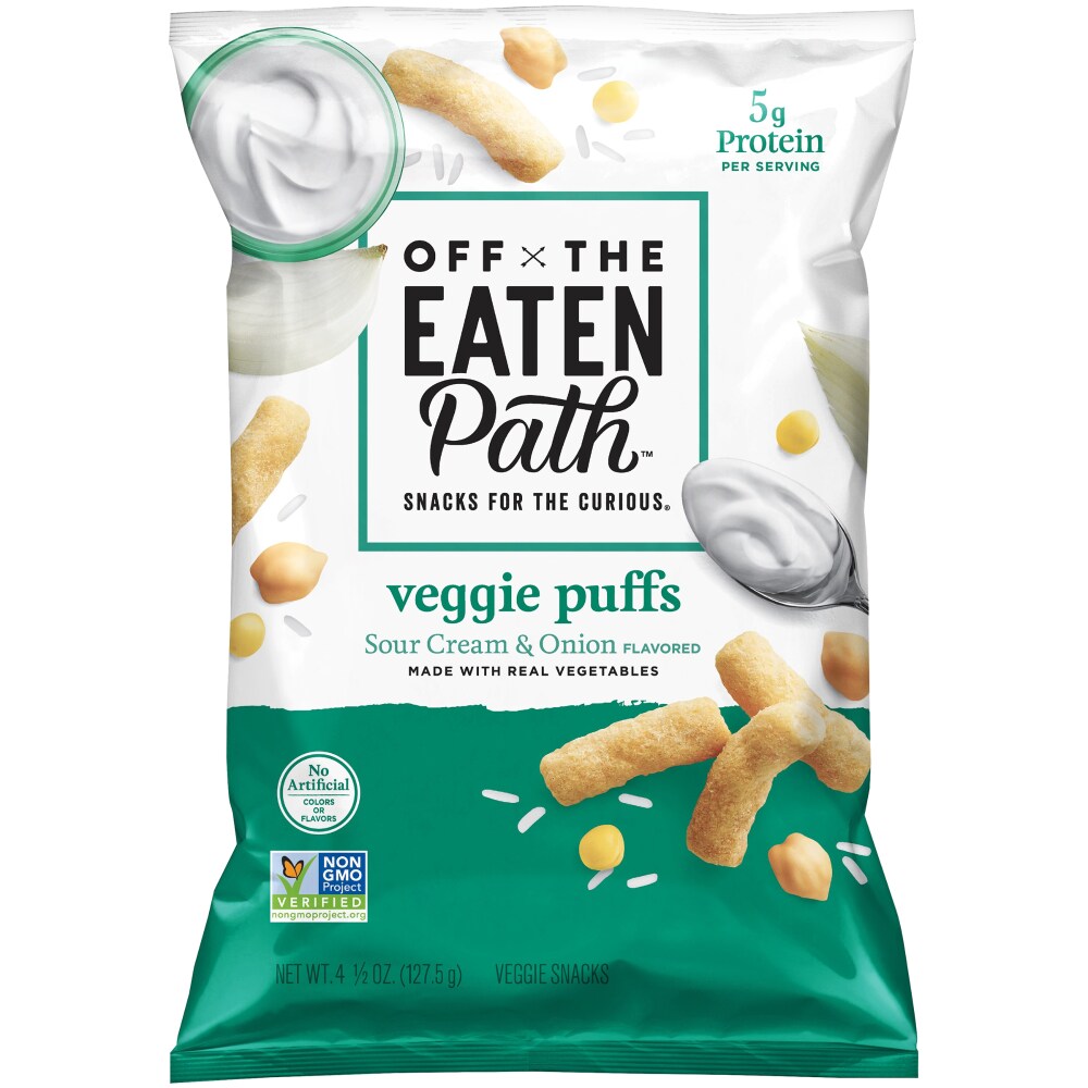 Hungry for a new adventure? Try Off the Eaten Path veggie puffs- deliciously different from chips. Packed with chickpeas, peas, and a tangy twist, you'll discover a new take on real veggies! Keep feeding your curious.