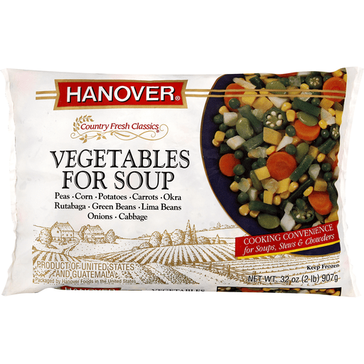 Peas, Corn, Potatoes, carrots, okra, rutabaga, green beans, lima beans, onions, cabbage, cooking convenience for soups, stews & chowders. Hanover Foods, nestled in the heart of Pennsylvanias bountiful farmlands, proudly presents Country Fresh Classics. Premium quality, naturally delicious frozen vegetables, specialty vegetables and vegetable blends, each carefully prepared to preserve their fresh from the country taste. Country Fresh Classics nature's finest in classic style. Product of United States and Guatemala.
