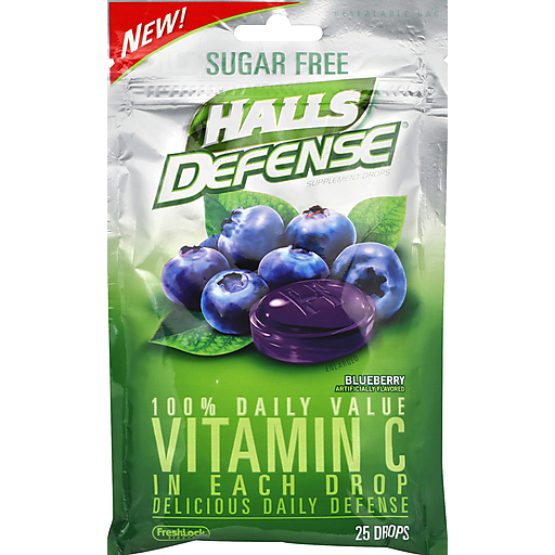 100% daily value vitamin C in each drop. Delicious defense. Artificially flavored. Halls Defense Vitamin C Supplement Drops help keep you going by helping to support your immune system. Every delicious, fruit-flavored drop provides 100% of the daily value of vitamin C. (This statement has not been evaluated by the Food and Drug Administration. This product is not intended to diagnose, treat, cure, or prevent any disease). Made in Canada.