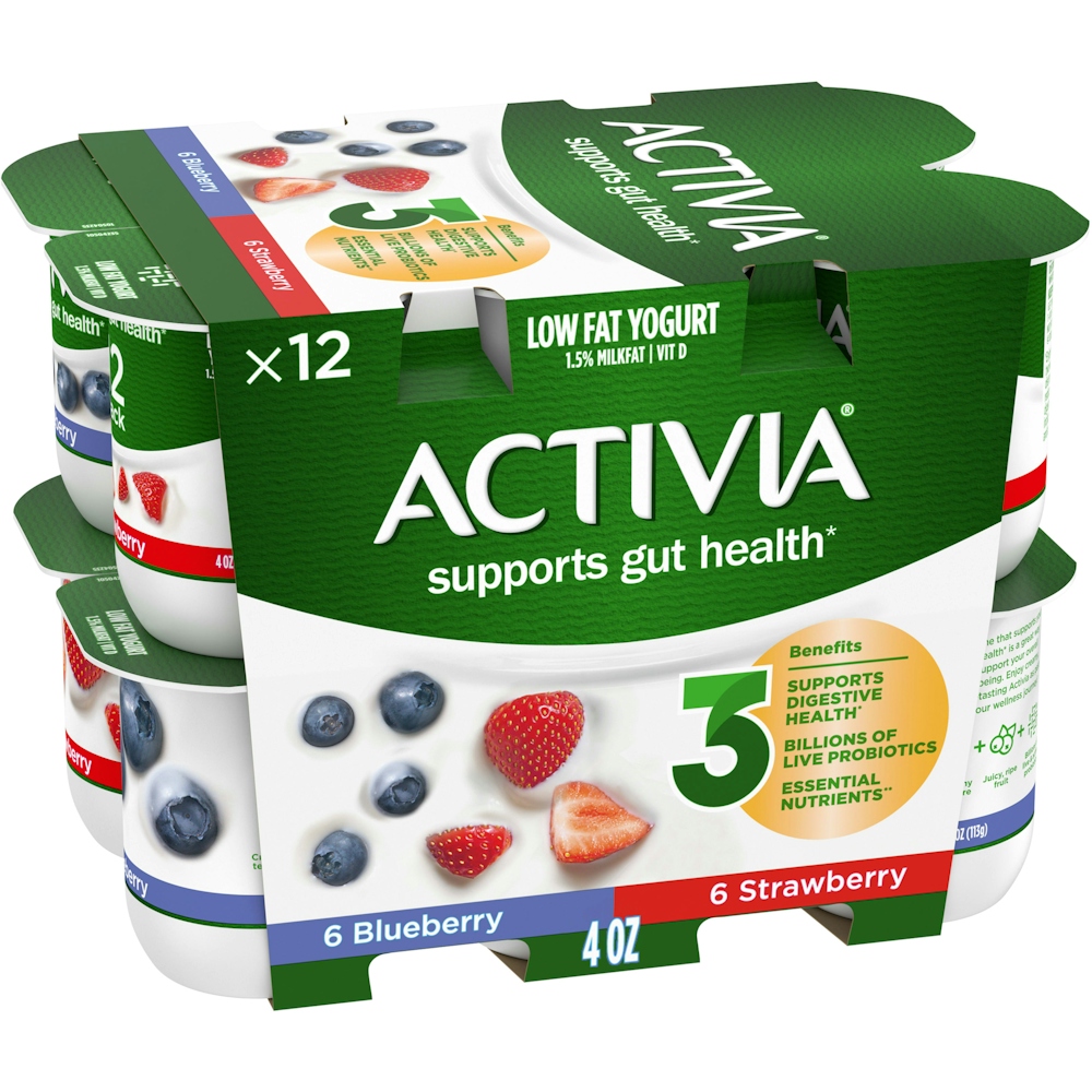Probiotic low-fat yogurt. Strawberry and blueberry flavors. Single-serve cups. Supports gut health with live and active probiotics. Non-GMO Project Verified. Part of a healthy lifestyle.