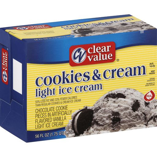 Chocolate cookie pieces in artificially flavored vanilla light ice cream. 55% less fat and 33% fewer calories than regular cookies & cream ice cream. Clear Value Light Cookies & Cream Ice Cream contains 4 g of fat, 120 calories per serving. Regular Cookies & Cream Ice Cream contains 9 g of fat, 180 calories per serving. Satisfaction guaranteed.