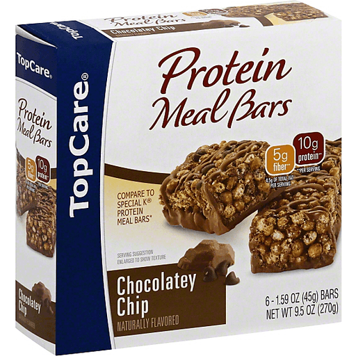 Naturally flavored. Compare to Special K Protein Meal Bars (Special K is a registered trademark of Kellogg NA Co. This product is not manufactured or distributed by Kellogg NA Co). 5 g fiber (per serving). 4.5 g of total fat per serving. 10 g protein (per serving). Questions? 1-888-423-0139. www.topcarebrand.com.