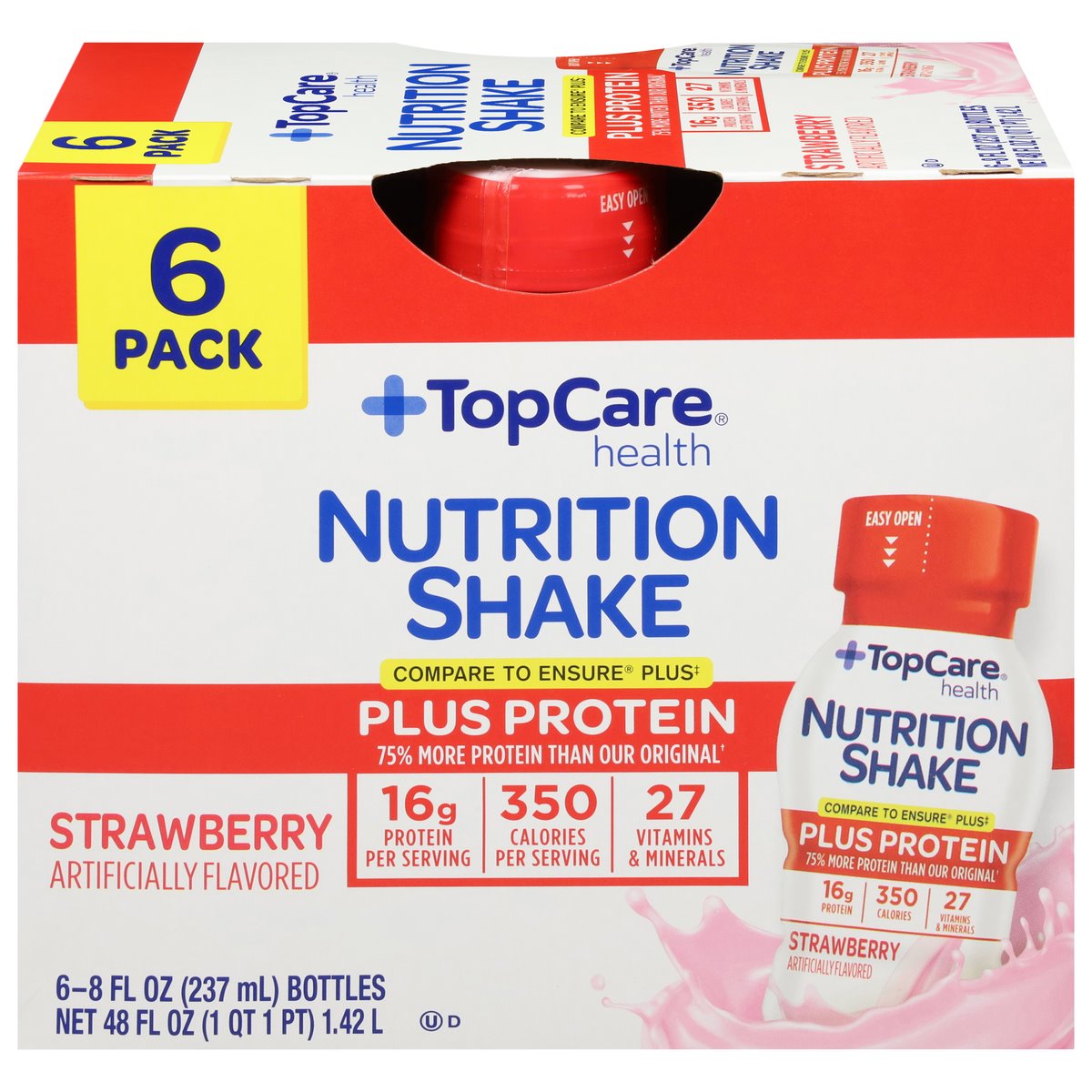 Health Nutrition Shake, Strawberry, Plus Protein, 6 Pack. Artificially flavored. 16 g protein per serving. 350 calories per serving. 40% Daily Value of vitamin D per serving. Gluten free. 75% more protein than our original (Our Plus Protein Nutritional Shakes contain 16 g of protein per 8 fl oz. Our Original Nutritional Shakes contain 9 g of protein per 8 fl oz). 27 vitamins & minerals. Excellent source of calcium and vitamin D. Compare to Ensure Plus (Ensure Plus is a registered trademark of Abbott Laboratories. TopCare Plus Protein Shake is not made by or affiliated with Abbott Laboratories). Every bottle of ready to drink TopCare Plus Protein Nutritional Shake has more protein than our Original (Our Plus Protein Nutritional Shakes contain 16 g of protein per 8 fl oz. Our Original Nutritional Shakes contain 9 g of protein per 8 fl oz) - with 16 grams of protein, 27 essential vitamins & minerals and 350 calories to supplement your diet and help you gain or maintain weight. Quality Guaranteed: This TopCare product is laboratory tested to guarantee its highest quality. Your total satisfaction is guaranteed. www.topcarebrand.com. Scan for more food information or call 1-888-423-0139. Questions? 1-888-423-0139. topcare(at)topco.com. www.topcarebrand.com. Assembled in USA.
