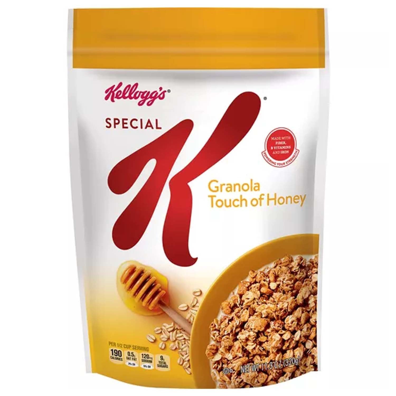 Do what's delicious with Special K Granola Touch of Honey. Includes 1, 11.3-ounce resealable bag of wholesome whole grain breakfast cereal made from tasty ingredients. Crispy bites of granola with a hint of real honey for the perfect amount of sweetness help you stay on track for the day ahead. Nutritious and delicious, every bowl provides a good source of 8 vitamins and minerals. Made with fiber, B vitamins, and iron. Contains no artificial colors or flavors. Make it an irresistible, low-fat part of your morning; Also enjoy it for lunch, dinner or late-night snack. Try it as a convenient work day or between-meal treat. Enjoy Special K Granola with dairy or nut-milk. Add it to your favorite yogurt, smoothie, or trail mix recipe. Morning time or any time, Kellogg's Special K Touch of Honey Granola cereal is a flavorful choice the whole family can feel good about. Comes in a convenient resealable bag that's packed for freshness.