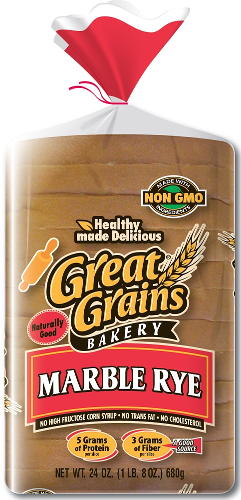 MARBLE RYE Premium Wide Pan 5/8" Sliced Bread tastes DELICIOUS. HEALTHY MADE DELICIOUS. Naturally Good & All Natural. No high fructose corn syrup. No Trans Fat. No Cholesterol. 5 Grams of Proteins Per Slice. 3 Grams of Fiber Per Slice-A Good Source. Always Made With Non-GMO.