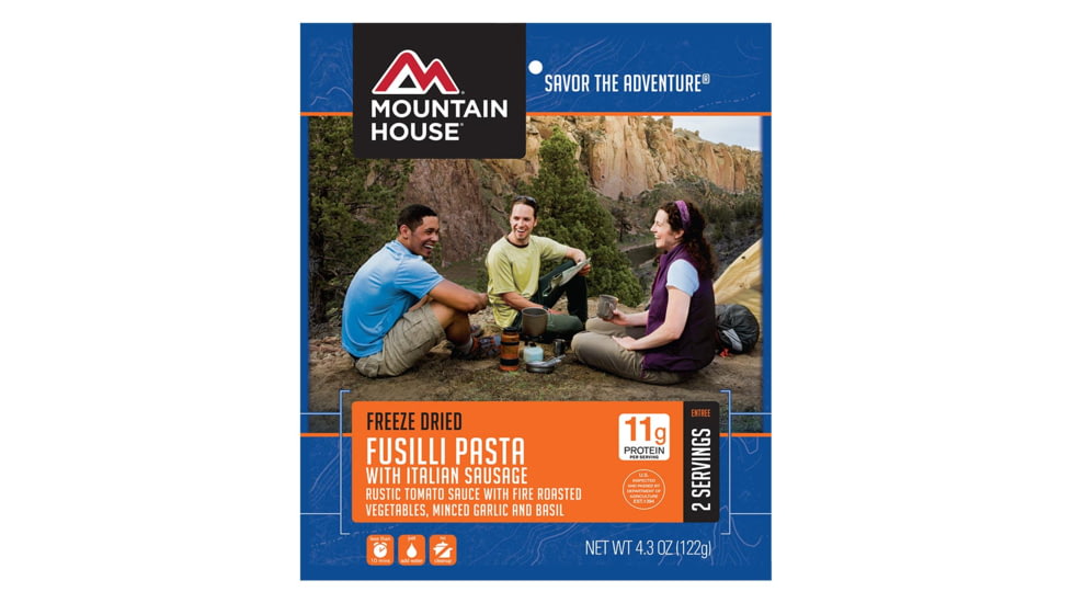 Product Info for Mountain House Fusilli Pasta with Italian Sausage Enjoy an authentic Italian-stye meal anywhere adventure takes you! Mountain House's new Fusilli Pasta with Italian Sausage has captured Nonna's secret homemade recipe and is bringing it to your next campout. This hearty entree is a spun fusilli pasta in a rustic tomato sauce made with fire-roasted veggies, garlic, basil and Italian-style sausage. Just add hot water and in minutes you'll enjoy Fusilli Pasta at home for a quick dinner, or take it to-go for a comforting meal wherever adventure takes you. Staying true to grandma's recipe, Mountain House Fusilli Pasta is made with real, whole ingredients with no artificial flavors, colors, or preservatives. Assapora l'avventura!