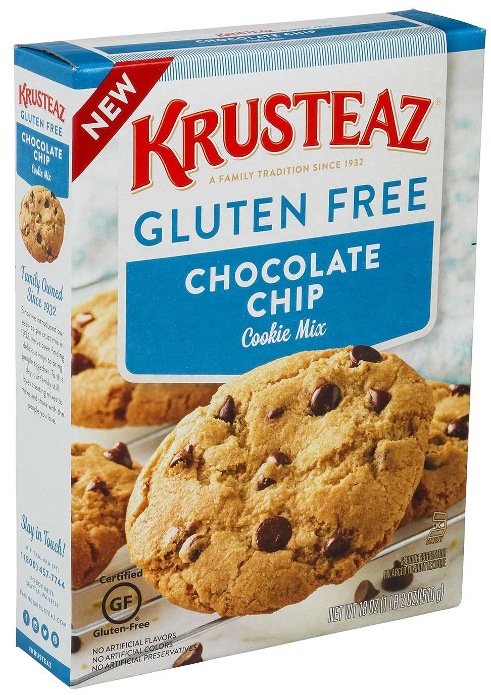 One of lifes truest simple pleasures is a warm, gooey chocolate chip cookie. At Krusteaz, we believe no one should be denied that joy. That's why our gluten free chocolate chip cookie mix is quick and easy to make. Just add eggs, water, and butter to your mix and youll be biting into a perfect cookie in no time. With no artificial colors, no artificial flavors and no artificial preservatives, these Krusteaz cookies are the perfect gluten free treat. Krusteaz Gluten Free Chocolate Chip Cookie Mix comes in a 18-oz box.