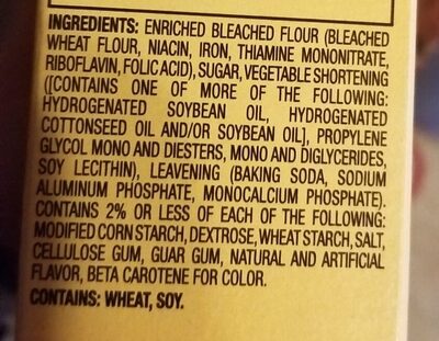 Enriched Bleached Flour (Bleached Wheat Flour, Niacin, Iron, Thiamine Moñonitrate, Riboflavin, Folic Acid), Sugar, Vegetable Shortening ([Contains One of More of the Following: Hydrogenated Soybean Oil, Hydrogenated Cottonseed Oil And/Or Soybean Oil], Propylene Glycol Mono and Diesters, Mono and Diglycerides, Soy Lecithin), Leavening (Baking Soda, Sodium Aluminum Phosphate, Monocalcium Phosphate). Contains 2% or Less of Each of the Following: Modified Corn Starch,Dextrose, Wheat Starch,Salt, Cellulose Gum, Guar Gum, Natural and Artificial Flavor, Beta Carotene for Color. Contains: Wheat, Soy.