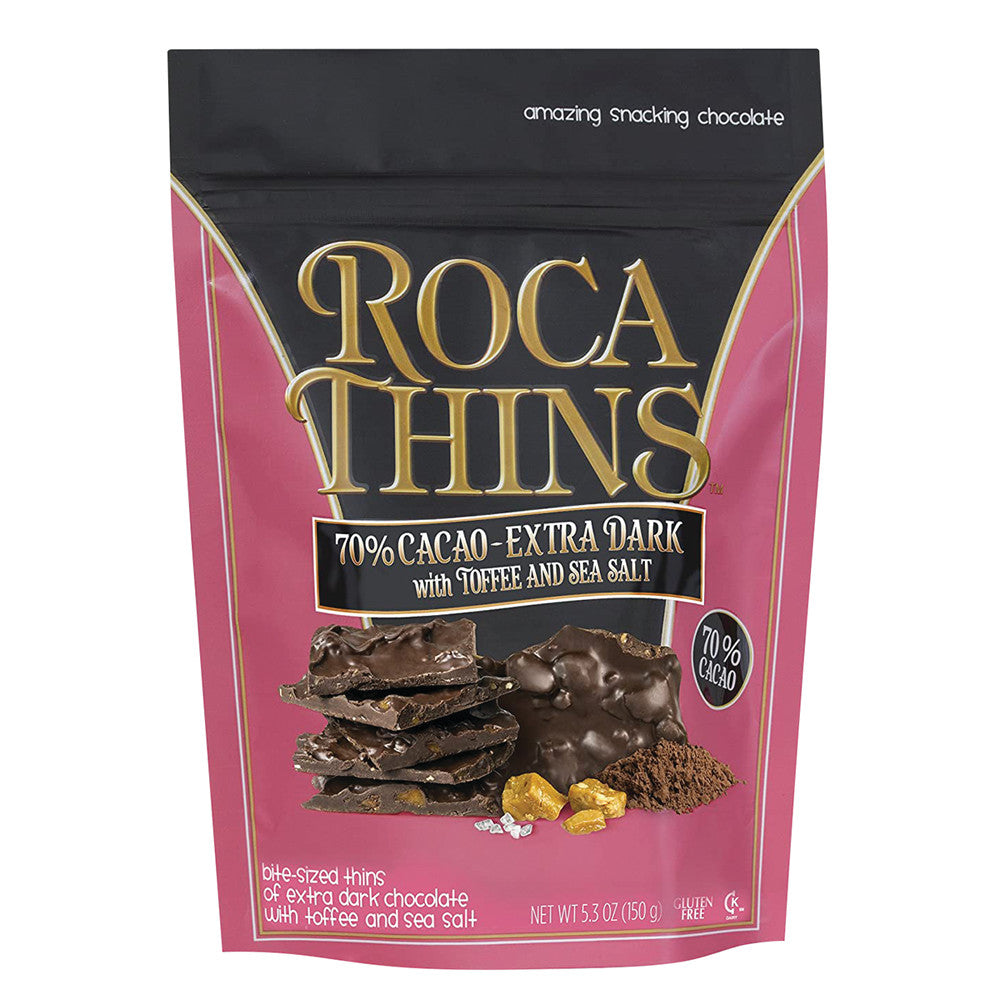 Twist on classic candy. 70% Cacao chocolate thins with toffee pieces. Grab & Go appeal. A candy icon updated for today's lifestyle trends like Brown & Haley 70% Cacao Extra Dark Chocolate Roca Thins will be a welcome sight in your grab & go section. Bits of Roca's iconic toffee studs super thin, rich expertly crafted 70% cacao dark chocolate for an everyday bite-size indulgence. A high contrast standup pouch featuring recognizable Roca branding attracts attention.