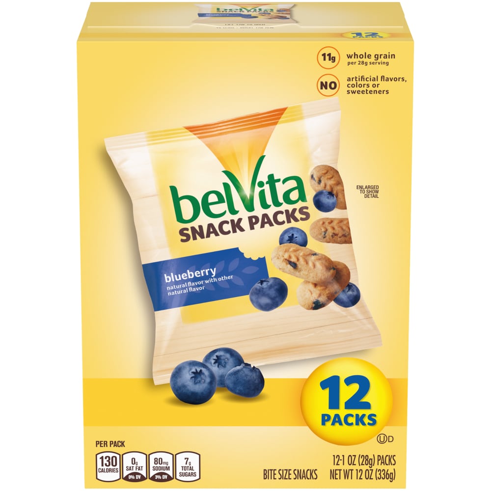 Made with a tasty combination of whole grains and other real ingredients, the mini but mighty belVita Bites Blueberry Mini Breakfast Biscuits are a wholesome way to jumpstart your day. Gently baked for a slow release of steady energy, they fuel you for up to 4 hours. Easy Morning Nourishment. Simplify mornings with pre-portioned snack packs of bite-sized biscuits. This package includes 12 individually wrapped 1 oz snack packs of belVita Bites Blueberry Mini Breakfast Biscuits. Make Every Day Sunny. A nutritious breakfast begins the day right. These biscuit bites have 19g of whole grains and 2g of fiber per serving, with no artificial flavors or sweeteners. Add belVita Bites Blueberry Mini Breakfast Biscuits to your cart for easy morning nourishment.