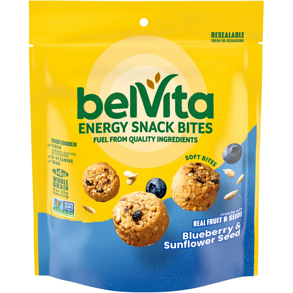 Blueberry and Sunflower Seed belVita Energy Snack Bites are delicious snacks to help fuel your busy morning. Made with real fruit and seeds, these soft, tasty snack bites have a delightful flavor combination and texture. Each serving (four snack bites) contains 14 grams of whole grain and 4.5 grams of total fat, and belVita Energy Bites are a good source of fiber, iron, and B vitamins. Made from wholesome grains and other quality ingredients, these delicious energy snack bites contain no high fructose corn syrup and no artificial flavors, colors, or sweeteners. They’re also kosher and Non-GMO Project Verified, making them a wonderful alternative to traditional blueberry muffins, breakfast snacks, and breakfast bars. Packaged in resealable snack packs that are great for sharing, they make wonderful office snacks, school snacks, and on the go snacks. When you need a snack with fuel from quality ingredients, reach for belVita Energy Snack Bites.