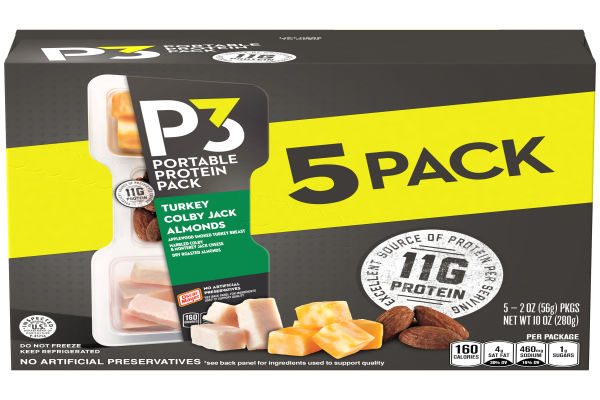 Oscar Mayer P3 Turkey, Almonds and Colby Jack Portable Protein Packs shake up your snacking routine with a deliciously convenient protein snack pack. Each pack contains snack-sized portions of applewood smoked turkey breast, dry roasted almonds and marbled Colby and Monterey Jack cheese. P3 is an excellent source of protein, with 13 grams per serving. P3 also has 1 gram of fiber. Ready to eat right from the fridge, these individual protein snacks are a delicious source of energy when you need a boost. This box of five 2 ounce portable meat and cheese trays is perfect when you're on-the-go. Keep P3 refrigerated/ chilled until ready to enjoy. P3 Portable Protein Packs are the more interesting way to get your protein.