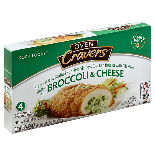 Breaded raw stuffed boneless skinless chicken breasts with rib meat stuffed with broccoli & cheese. Individually wrapped entrees. Inspected for wholesomeness by US Department of Agriculture. Serves 4. Koch Foods makes it easy to bring restaurant-quality products home to your family. We make the food that will make your entire family happy. Meals are full of flavor again. With Koch Foods Oven Cravers you can prepare a delicious and convenient meal that reminds you of the kind you used to love. Our fresh frozen stuffed chicken breasts are the perfect way to bring the family around the table together. Koch Foods guarantees that this product meets our highest quality expectations. Carton made from recyclable material.