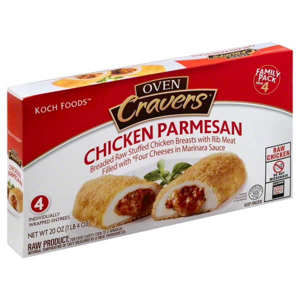 Breaded raw stuffed chicken breasts with rib meat filled with four cheeses (smoked provolone cheese; mozzarella cheese; romano style cheese; parmesan cheese) in marinara sauce. Individually wrapped entrees. Inspected for wholesomeness by US Department of Agriculture. Serves 4. Koch Foods makes it easy to bring restaurant-quality products home to your family. We make the food that will make your entire family happy. Meals are full of flavor again. With Koch Foods Oven Cravers you can prepare a delicious and convenient meal that reminds you of the kind you used to love. Our fresh frozen stuffed chicken breasts are the perfect way to bring the family around the table together. Koch Foods guarantees that this product meets our highest quality expectations. Carton made from recyclable material.