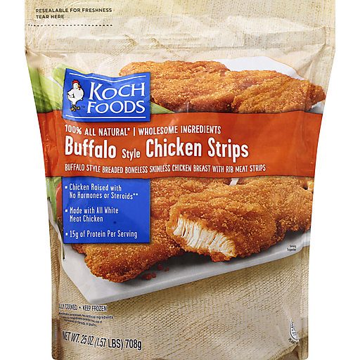 Buffalo style breaded boneless skinless chicken breast with rib meat strips. 100% natural (Minimally processed. No artificial prohibit the use of ingredients). Whole ingredients. Chicken raised with no hormones or steroids (Federal regulations prohibit the use of hormones or steroids in poultry). Made with all white meat chicken. Made from wholesome ingredients like real white meat chicken, real hot sauce, and deliciously simple seasonings. 15 g protein per serving. At Koch Foods, we are committed to using simple, 100% All Natural (Minimally processed. No artificial prohibit the use of ingredients) ingredients to provide you with the best-tasting products. Koch Foods, Inc.