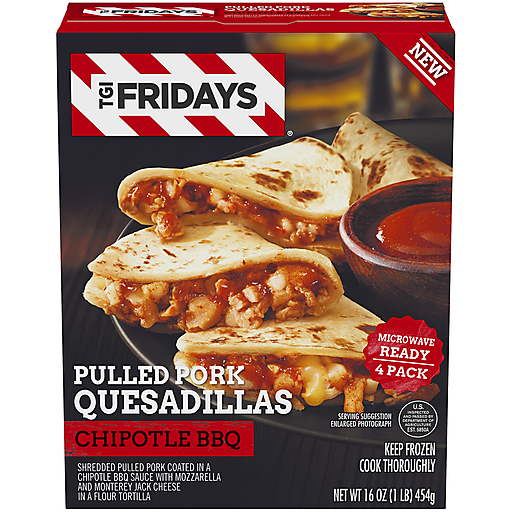 Shredded pulled pork coated in a Chipotle BBQ sauce with mozzarella and Monterey jack cheese in a flavor tortilla. New. Microwave ready. U.S. Inspected and Passed by Department of Agriculture. www.fridaysinyourfreezercom. Questions or comments? Call 1-800-457-9810, Monday - Friday. Please have packaging available when calling. To learn more about TGI Friday frozen snacks, visit www.fridaysinyourfreezercom. Please recycle this carton. TGI Fridays Pulled Pork Quesadillas let you enjoy restaurant style appetizers in the convenience of your home. These frozen microwave quesadillas come ready to heat and enjoy anytime a craving strikes. Pulled pork coated in chipotle BBQ sauce, mozzarella and monterey jack cheese fill each flour tortilla for a twist on traditional quesadilla flavor. These snack size pork and cheese quesadillas are perfect as an easy appetizer at your next party or as a quick snack on any day. Heat these frozen quesadillas in just a few minutes in your microwave, or pop them in the oven for crispy results. The pork quesadillas come packaged in a 16 ounce box for protection in the freezer until you heat them.