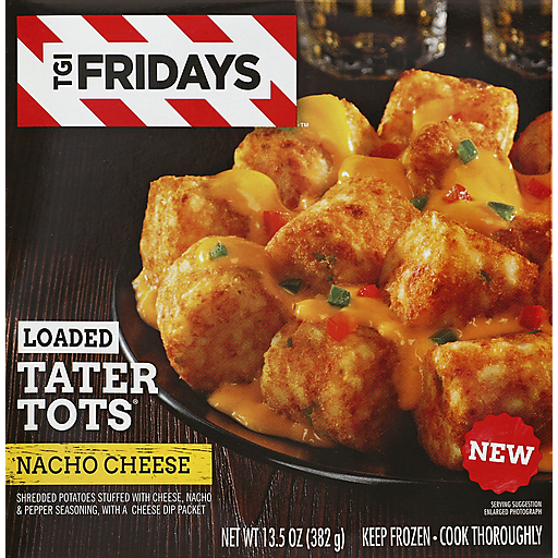 Shredded potatoes stuffed with cheese, nacho & pepper seasoning, with a cheese dip packet. New. Make any night a Friday. Questions or comments? Call 1-800-457-9810, Monday - Friday. Please have packaging available when calling. To learn more about TGI Friday's frozen snacks, visit www.fridaysinyourfreezer.com.