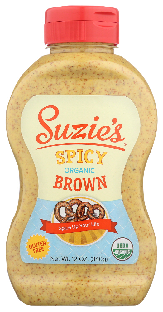 SUZIE S SPICY BROWN ORGANIC MUSTARD OFFERS AN EASY WAY TO ADD SOME ZING TO YOUR SANDWICHES BURGERS AND HOT DOGS. MADE WITH ORGANIC WHITE DISTILLED VINEGAR MUSTARD SEED SPICES AND TURMERIC THIS DELI-STYLE MUSTARD ALSO PAIRS WELL WITH PRETZELS AND SUMMER SAUSAGE FOR UPSCALE SNACKING. RELY ON THE 12 OZ. SQUEEZE BOTTLE FOR EASY DISPENSING AND ENJOY TASTY FLAVOR WITH JUST 5 CALORIES PER 1 TSP. SERVING.