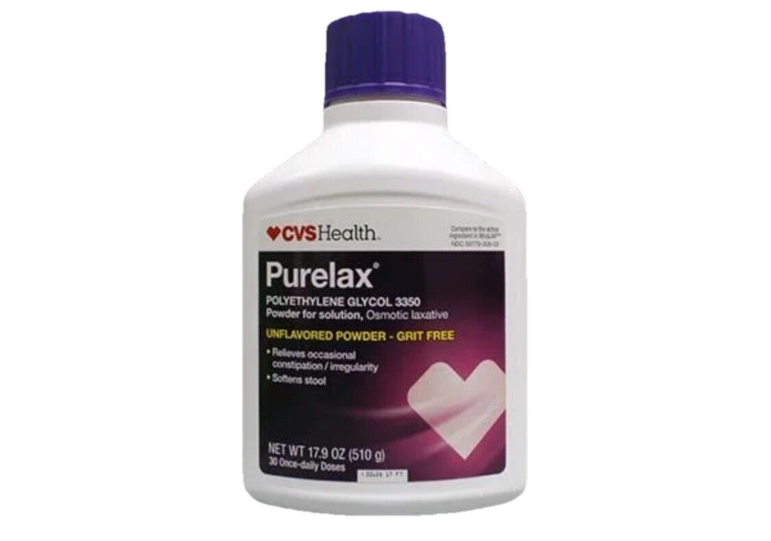 Sugar Free Dissolves in Any Beverage Peel Kere Cvs Healthtm Purelax® Increases Frequency of Bowel Movements and Softens the Stool. Drug Facts Active Ingredient (in Each Dose) Polyethylene Glycol 3350, 17 G (Cap Filled to Line)... Purpose ....Osmotic Laxative Use Relieves Occasional Constipation (Irregularity) Generally Produces a Bowel Movement in 1 to 3 Days Warnings Allergy Alert: Do Not Use If You Are Allergic to Polyethylene Glycol Do Not Use If You Have Kidney Disease, Except Under the Advice and Supervision of a Doctor Ask a Doctor Before Use If You Have Nausea, Vomiting or Abdominal Pain a Sudden Change in Bowel Habits That Lasts Over 2 Weeks Irritable Bowel Syndrome Ask a Doctor or Pharmacist Before Use If You Are Taking a Prescription Drug When Using This Product You May Have Loose, Watery, More Frequent Stools 2203243 Stop Use and Ask a Doctor If Wyou Have Rectal Bleeding or Your Nausea, Bloating, 0110905 Cramping or Abdominal Pain Gets Worse. These May Be Signs of a Serious Condition. You Get Diarrhea 10/2022 You Need to Use a Laxative for Longer Than 1 Week : 306E 7 B6 #713639 50428 30760