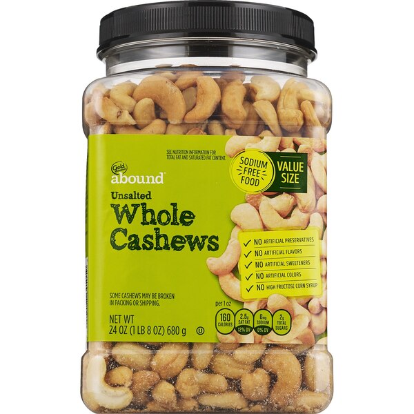 - The manufacturer of Unsalted Whole Cashews is Gold Emblem Abound.