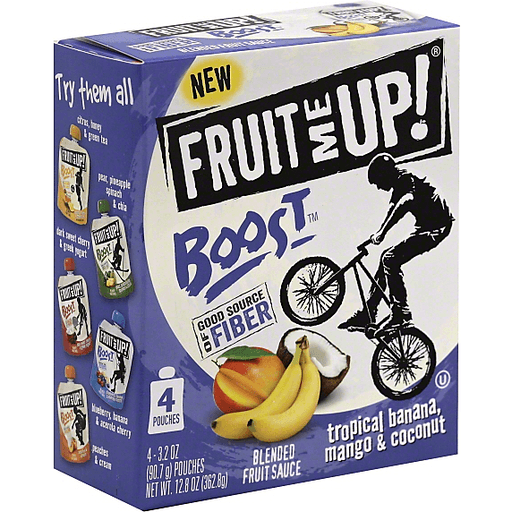 New. Good source of fiber. Fruit pouches with added nutrients for a naturally better snack. Kids, teens and families will enjoy a great tasting fruit Boost snack anywhere, any time. Added fiber is an important nutrient in your diet. All natural ingredients. Boost of nutrition. Made with fresh apples. Made with no genetically or engineered ingredients. Certified gluten-free. www.FruitMeUp.com. Please recycle. Made in the USA.