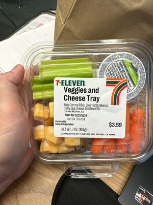 - The product category for 7-Eleven Veggies and Cheese Tray is Veggie Ans Cheese Tray.