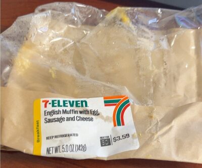 7-Eleven English Muffin with Sausage, Cage Free Egg, and American Cheese Keep Refrigerated Net Wt. 4.5 Oz (128G) Heat for 30 $4.19