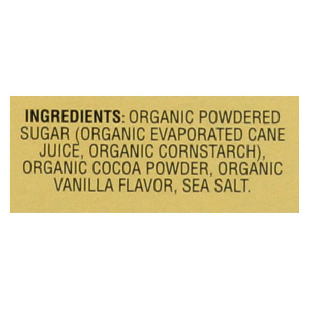 Organic Powdered Sugar (Organic Evaporated Cane Juice, Organic Cornstarch), Organic Cocoa Powder, Organic Vanilla Flavor, Sea Salt.