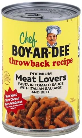 - The manufacturer of Premium Meat Lovers Pasta in Tomato Sauce with Italian Sausage and Angus Beef is Chef Boyardee.