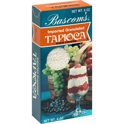Quick cooking. Imported. Bascom's Granulated Tapioca makes an excellent thickener, use in place of corn starch or flour in fruit pies, or add to your favorite packaged pudding. Serve with whipping cream, fresh fruits, candies, Meringues, Nutmeats, Coconut, and spices.