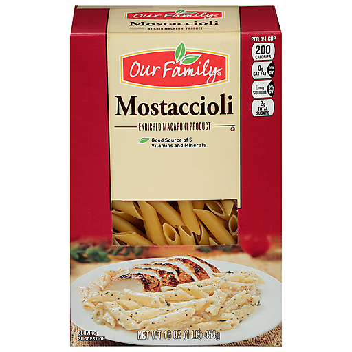 - The manufacturer of Enriched Macaroni Product, Mostaccioli is Our Family.