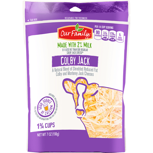 - The manufacturer of Reduced Fat Shredded Colby Jack Cheese is Our Family.