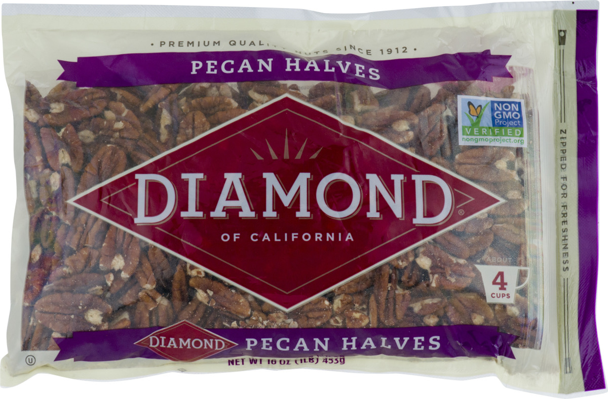 About 4 cups. Premium quality nuts since 1912. Diamond of California. Non GMO Project verified. nongmoproject.org. Diamond Nuts make good food better. Diamond Premium Pecans are made for homemade. Whether it's a salad, entree, side dish or dessert, we help good recipes become great. That's why home cooks have trusted the quality, freshness and value of Diamond since 1912.