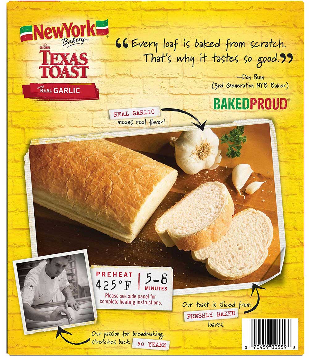 - The manufacturer of The Original Texas Toast with Real Garlic is New York Bakery.