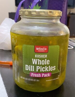 Whole Kosher Dill Pickles is manufactured by Winco Foods, Inc. with a suggested serving size of 0.5 Pickle | About (28 G) and has 0 calories per serving.