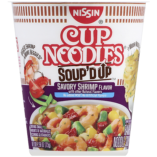 The original. With other natural flavors. No added msg (Contains small amounts of naturally occurring glutamates). No artificial flavors. Bigger shrimp & more veggies! (This package of Cup Noodles Soup'd Up has bigger dehydrated shrimp and higher content of dehydrated vegetables than our Cup noodles with shrimp 2.25 oz product). Wider noodles. 330 calories per container. Please visit us at www.nissinfoods.com.